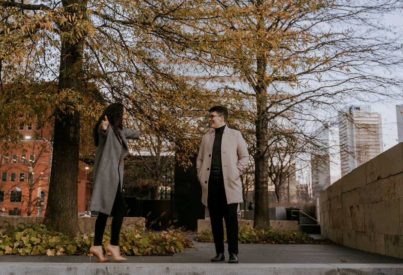 A question I often ask myself – coffee or wine? I say both! We started the session off with Rachel and Taylor cuddled up on their couch with coffee and sweet fur baby Bella. After getting a few sips of coffee in, we moved on to wine and slow dancing in the kitchen, of course. Fur baby Rocky stood guard during the dancing and had us laughing out loud for porch pictures. We wrapped up the engagement session at City Garden in downtown St. Louis, where Rachel and Taylor sported the chicest of coats and kept each other warm.